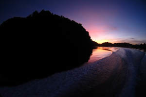 誰もいないブルーコーナー。魚の食欲が活性化する朝まづめの時間帯。ロウニンアジがクマザサハナムロの群れへ捕食アタックをかけるシーンやマンタの捕食シーンなどが見られます。移動中、ゆっくりと東の空が赤く染まります。感動。5amにホテルお迎えとなります。