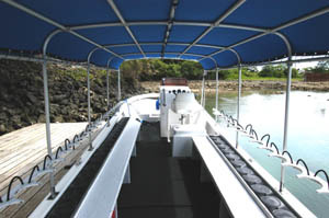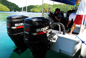 パラオでも先駆けて環境対応のコンピューター制御4サイクルマリンエンジンを搭載しました。これまでの2ストロークエンジンと違いオイルを海にまきません。またガソリンの使用量も従来の50%程度。駆動音も静かになりボート上での会話も弾みます。そしてあの特有の排気ガス臭がほぼありません。環境にも人にもやさしい自慢のエンジン。すべてのボートに搭載です。