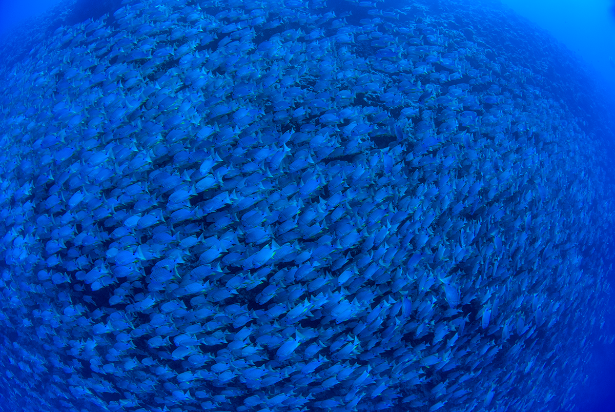 例年3月から5月の新月前にペリリューイエローウォール、ペリリューエキスプレスにて数万個体のイレズミフエダイが目撃されます。10日間程度リーフに滞在し産卵日までその数を増やし続けます。1日毎に2倍・4倍・8倍・16倍と産卵日まで群れは大型化していきます。日程の初期は日中イエローウォールに群れる巨大なイレズミフエダイの群れを狙います。後半日程は早朝の時間帯にコロールを出発し朝の産卵行動を狙います。産卵行動中はブルシャーク・シルキーシャークなど3m級の大型のサメが観察できます。ここ数年はジンベエザメも観察されます。
